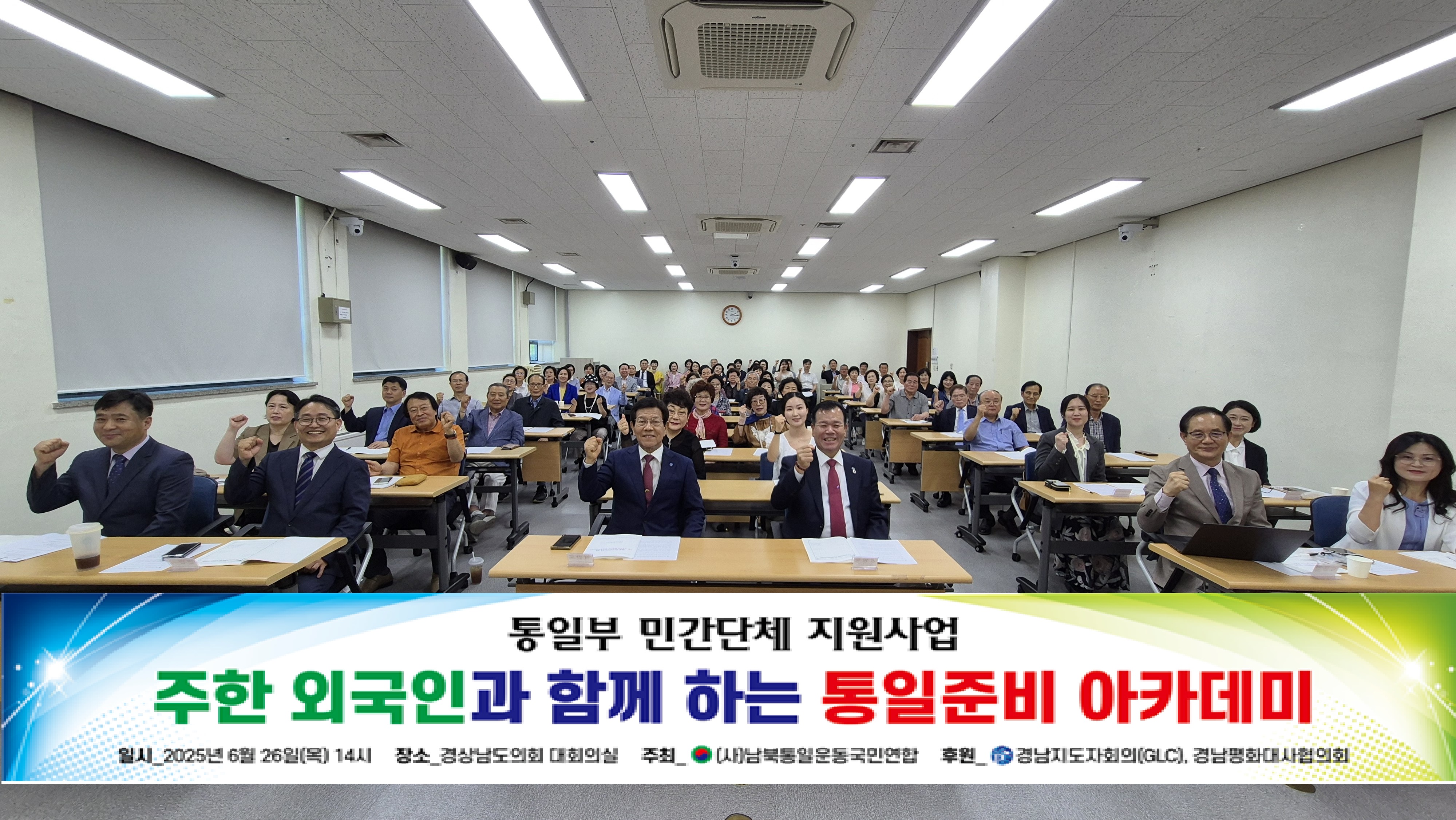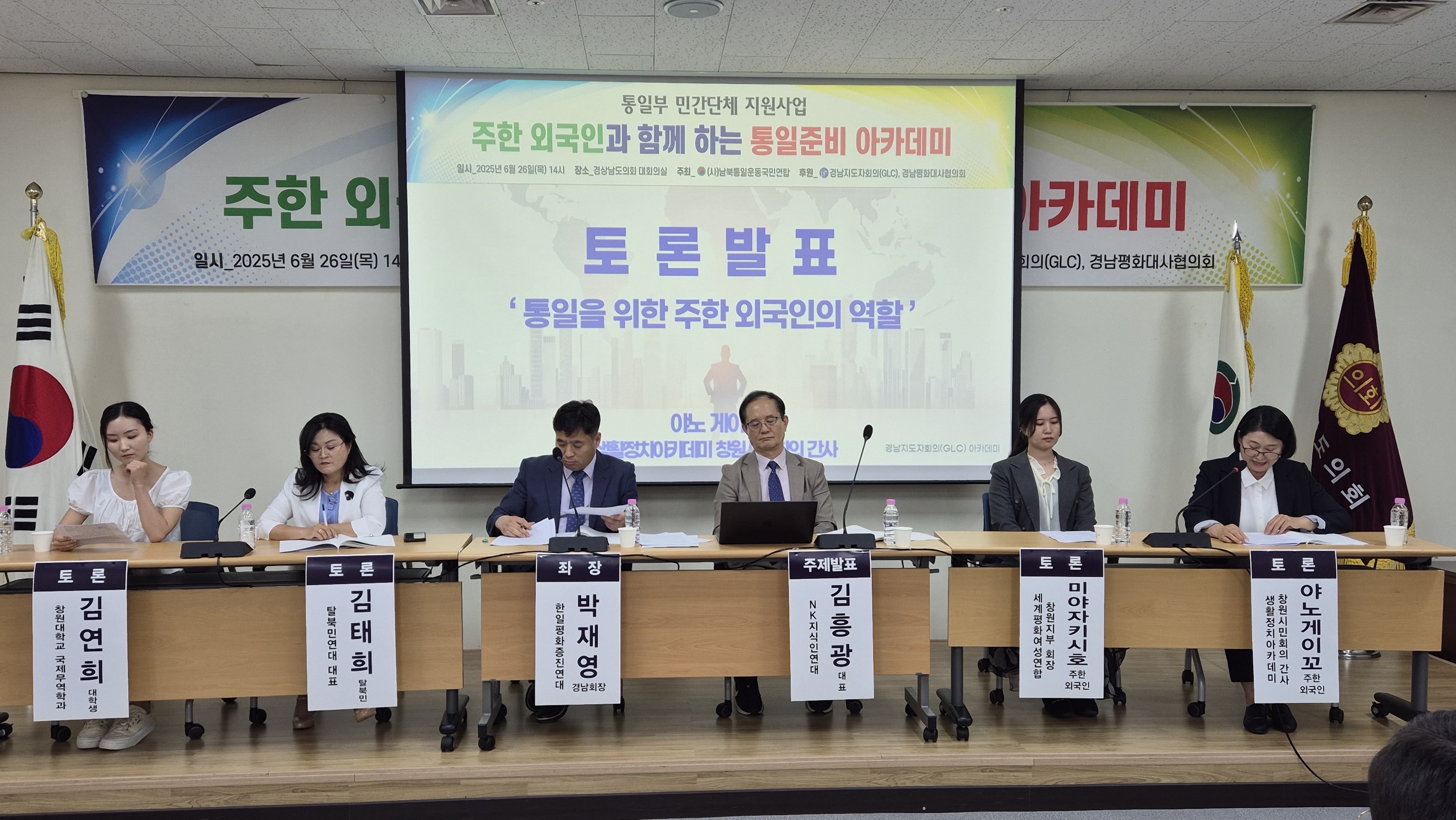 (사)남북통일운동국민연합 경남도회는 6월 26일 오후 2시, 경남도의회 대회의실에서 ‘주한 외국인과 함께하는 통일준비 아카데미’를 개최했다. 이번 행사는 통일부 민간단체 지원사업의 일환으로 마련됐으며, 외국인·탈북민·청년 등 다양한 계층이 참여해 통일에 대한 국제적 공감대를 확산하고 새로운 준비 방향을 모색하는 자리로 꾸려졌다. 행사에는 정쌍학 경남도의회 의원, 박진현·이재두 도의원, 김흥광 NK지식인연대 대표, 박판도 경남평화대사협의회장 등 각계 주요 인사가 함께했다.